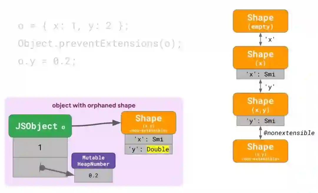 从分离 shape 开始,我们为 y 创建了一个可以重放所有之前的转变的新转变链 (transition chain),但是其中'y'被标记成 Double 表达。然后我们使用这个新的转变链并将旧的子树标记为废弃的。在最后一步我们把实例o迁移到了新的 shape,并使用了MutableHeapNumber来保存 y 的值。这样,新的对象就不会使用老的路径,而且一旦旧 shape 的引用小时,树中废弃的 shape 的那部分就会消失。