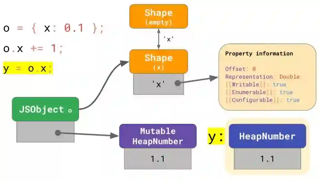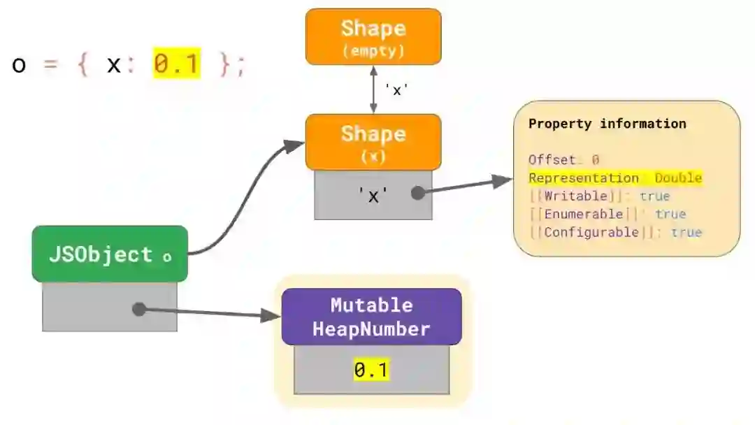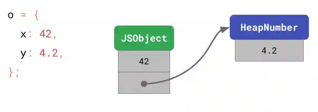 x 的值 42 可以被编码为 Smi,所以它可以被存储在对象自身中。而y的4.2需要一个分开的实体来保存这个值,然后这个对象指向那个实体。