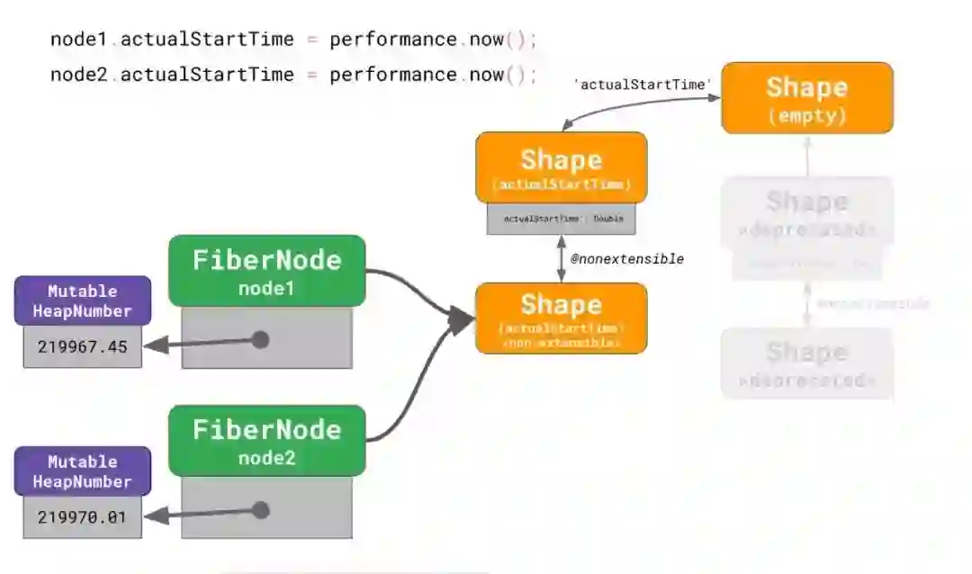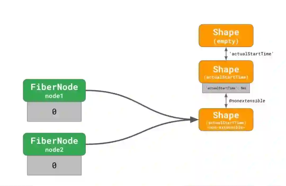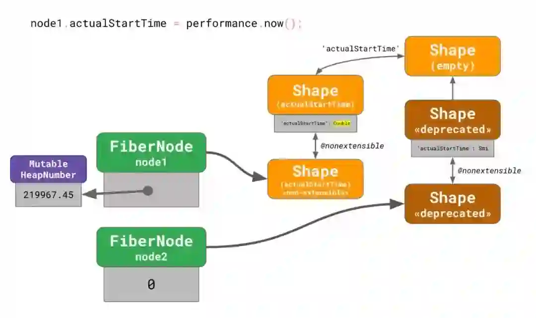 这两个FiberNode实例指向了不可扩展且actualStartTime为Smi表达的 shape。当第一个对node1.actualStartTime的赋值发生时,一个新的转变链被创建并且之前的转变链被标记为废弃的: