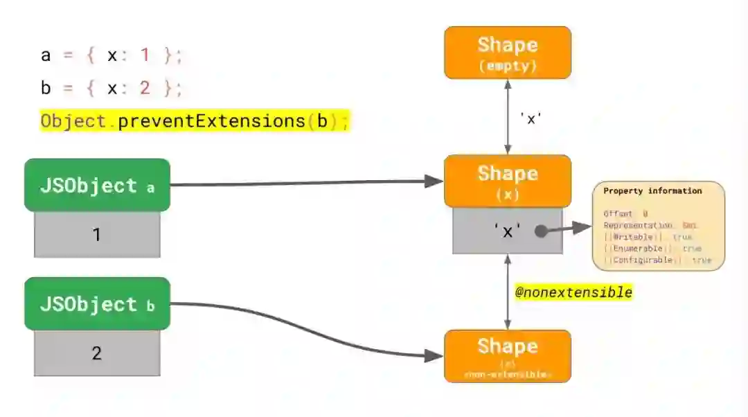 如我们之前所知,一切从空 shape 转变到一个包含属性'x'(以Smi形式表达) 的新 shape 开始。当我们阻止了对b的扩展,我们对新的 shape 进行了一个特殊的转变 -- 将其标记为不可扩展。这个特殊的转变没有引入任何新的属性 -- 它实际上只是个标记。