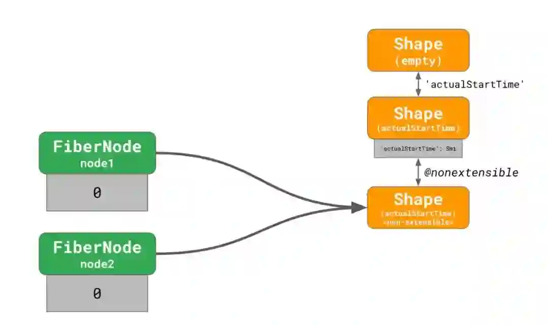 V8 指派了一个新的孤立 shape 给node1,然后稍后node2也发生了同样的情况,导致了两个孤岛,每个孤岛都有着自己不相交的 shape。很多真实的 React 应用不止有 2 个,而是有超过成千上万个FiberNodes。如你所想,这种情况对 V8 的性能来说不是什么好事。