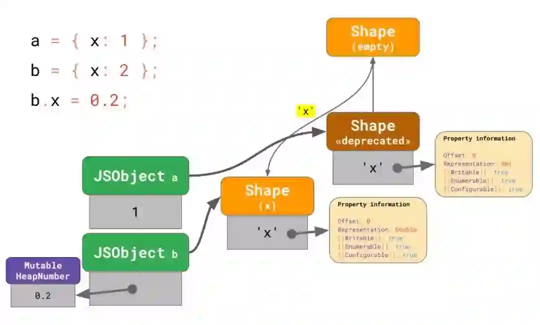当b.x修改为 Double 表达时,V8 分配了一个新的 shape 而且其中的x被指定为 Double 表达,并指向空 shape。V8 也会为属性 x 分配一个MutableHeapNumber来保存这个新的值0.2。然后当再更新对象b指向这个新的 shape,并更改对象中的槽以指向偏移 0 处的先前分配的MutableHeapNumber。最后,我们将旧的 shape 标记为废弃的并且将其从转变树 (transition tree) 中摘除。这是通过'x'从空 shape 到新创建的 shape 的转变 (transition) 来完成的。