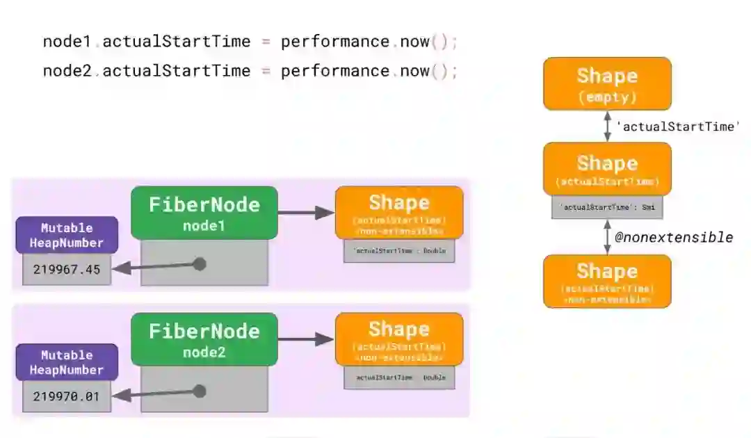 这些字段(比如说actualStartTime) 被初始化为0或者-1,因此一开始按照Smi表达。但是后面实际上存进来的是从performance.now()返回的浮点型时间戳,导致这些字段变成 Double 表达,因为这些数据不满足Smi表达的要求。最重要的是,React 还阻止了对FiberNode实例的扩展。