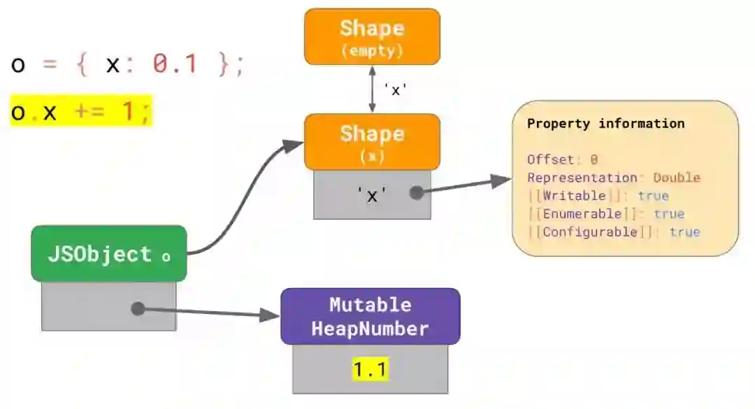 为了避免这个问题,V8 提供了一个优化更新非Smi的 number 字段的方法。当一个 number 字段保存了一个不再 Smi 范围内的值时,V8 在该对象的 shape 中将其标记为Double字段,并且分配一个被称为MutableHeapNumber的对象以 Float64 编码形式保存其值。