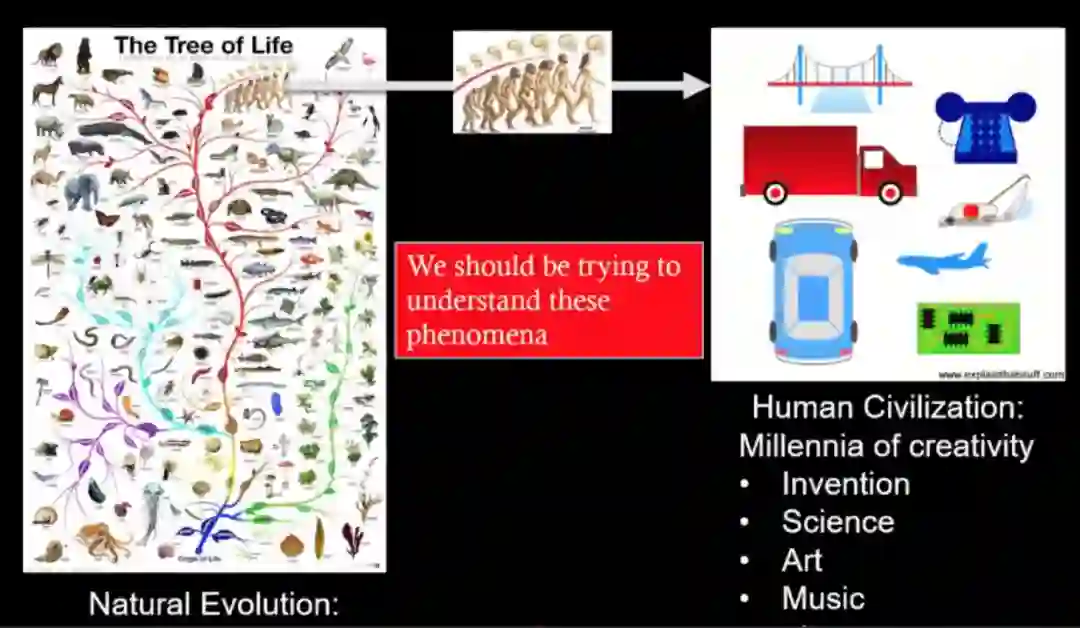 在这个系统基础上,当我们人类开始在宇宙中存在,凭借着人类这样一个“开放式创新系统”,便孕育出了人类文明,包括数千年的知识、科学、艺术等所有的发明创造,正如前面所说,从火和轮子,到计算机、空间站,以及人工智能等等,相继涌现。