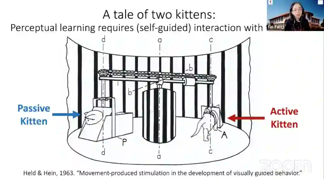 我在这里分享一个实验。这个实验室由Held 和Hein在1963年做的关于两只新出生小猫的实验,如下图所示,其中一只可以主动探索外部世界(注:在笼子中走动,来观察周围环境),另一只则是被动来看外部世界(注:不能行动,由另一只小猫的运动带动杠杆,从而观察周围环境)。世界结果表明,数周之后两个小猫的神经系统有巨大的差异,被动组的小猫不能发展具备完整功能的感知系统,而主动组的小猫则可以。