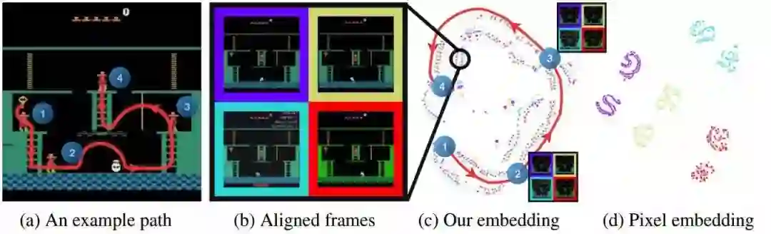 图2:对于(a)中所示的路径,使用(c)我们的嵌入与(d)原始像素形成的观察序列的t-SNE投影。在(b)中,四个不同的域在(b)中并排进行比较,以获得《蒙特祖玛的复仇》中的样本框架:(紫色)Atari学习环境,(青/黄)两个YouTube训练视频,以及(红色)未观看的YouTube视频。很显然,尽管(紫色)和(红色)在训练期间被搁置在一边,但在我们的嵌入空间中所有四条轨迹都很好地对齐。使用原始的像素值无法实现任何有意义的对齐。
