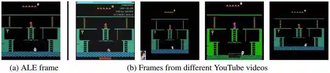在现有的模仿学习方法中,Hester等人所提出的DQfD已在Atari最难探索游戏中展示了最佳的性能表现。尽管取得了这些令人印象深刻的结果,但在DQfD和相关方法里面存在两个局限性。首先,他们假设智能体和演示者的观察空间之间没有“域差距”,例如,颜色或分辨率的变化,或其他视觉工件的引入。图1显示了《蒙特祖玛的复仇》(MONTEZUMA'S REVENGE)中“域差距”的一个例子,考虑了(a)我们的环境与(b)YouTube游戏画面相比的第一帧。其次,他们假设智能体可以访问确切的动作和奖励序列,而这些确切的动作和奖励序列导致了演示者的观察轨迹。在这两种情况下,这些假设限制了在人工条件下收集的那些有用的演示集,通常需要专门的软件堆栈以用于强化学习智能体训练的唯一目的。