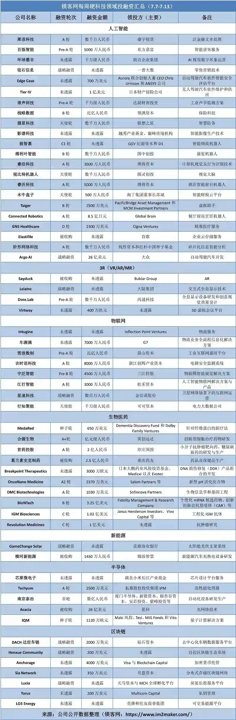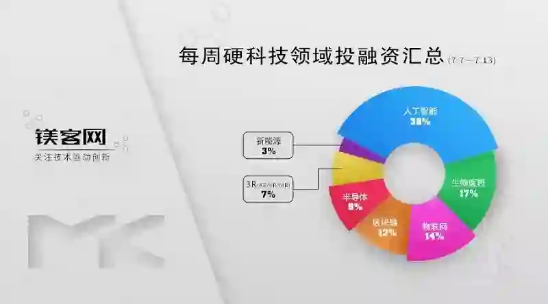 本周硬科技领域投融资事件一共57起,人工智能领域发生21起融资事件和1起收购事件,占比38%;生物医药领域发生9起融资事件和1起收购事件,占比17%;物联网领域发生8起融资事件,占比14%;区块链领域发生7起融资事件,占比12%;半导体领域发生4起融资事件和1起收购事件,占比9%;3R(VR/AR/MR)领域发生3起融资事件和1起收购事件,占比7%;新能源领域发生1起融资事件和1起收购事件,占比3%。
