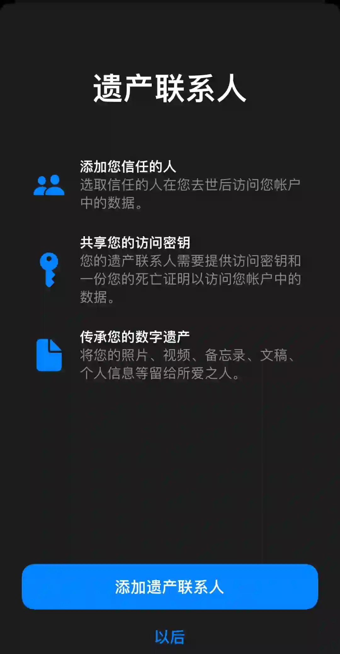 Apple ID 增加“遗产联系人”。在密码与安全性页面,会发现新增了“遗产联系人”选项。这也是作为 Digital Legacy 计划的一部分,在选项中设置指定联系人,用户去世后此联系人即可查看对方的 Apple ID 账户和个人信息。