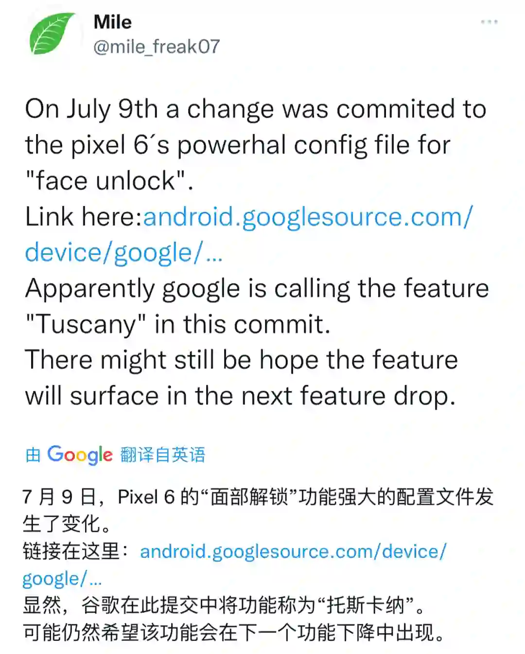 @ Freak07 表示,在谷歌 7 月 9 日发布针对 Pixel 6 系列的 PowerHAL 配置文件引入了一个代码变更。其变更描述表明谷歌在研发团队内部将面部解锁功能称为“Tuscany”,并且正在努力通过提高 CPU 集群来改善面部识别功能对电池的影响。