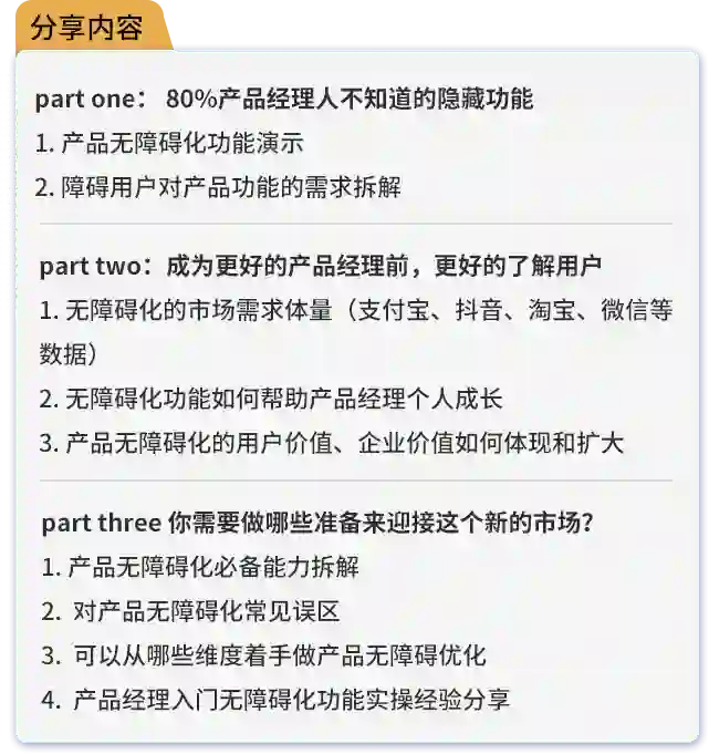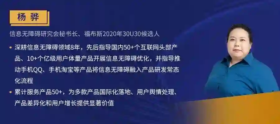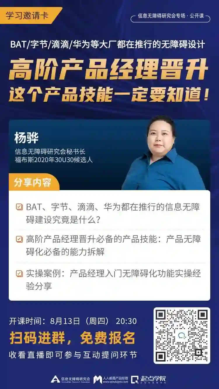 8月13日(周四)20:30,她将结合现有的一些产品无障碍化的实际案例,聊聊产品无障碍化的能力要求!