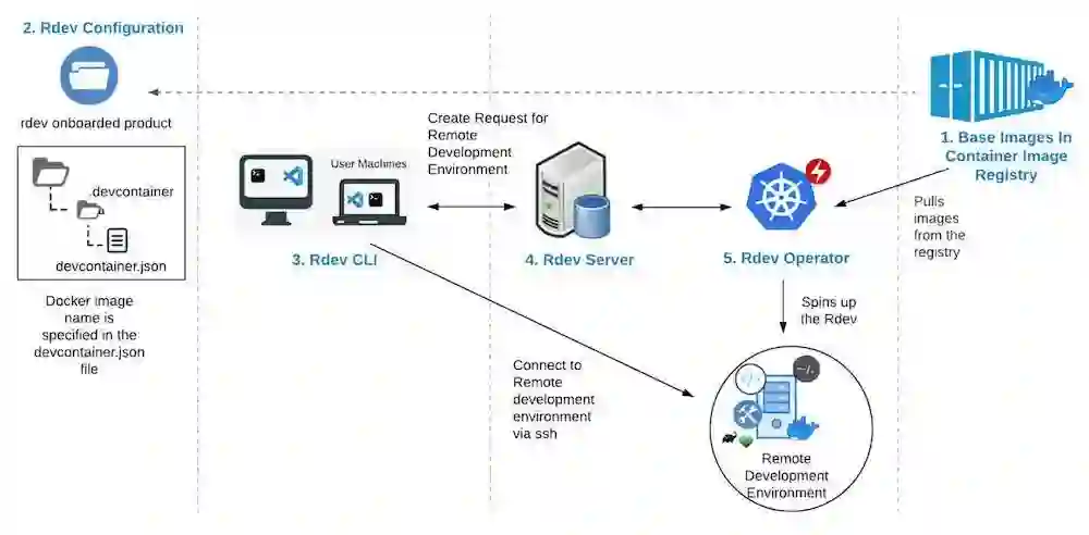 每个 RDev 都由一个 Kubernetes Pod 备份,该 Pod 由三个不可变的容器组成:RDev-init-workspace、RDev-sshd 和 RDev-sidecar。它还有两个主要的卷挂载,Home 和 Rdev Info,以及其他与证书和安全有关的必要卷。