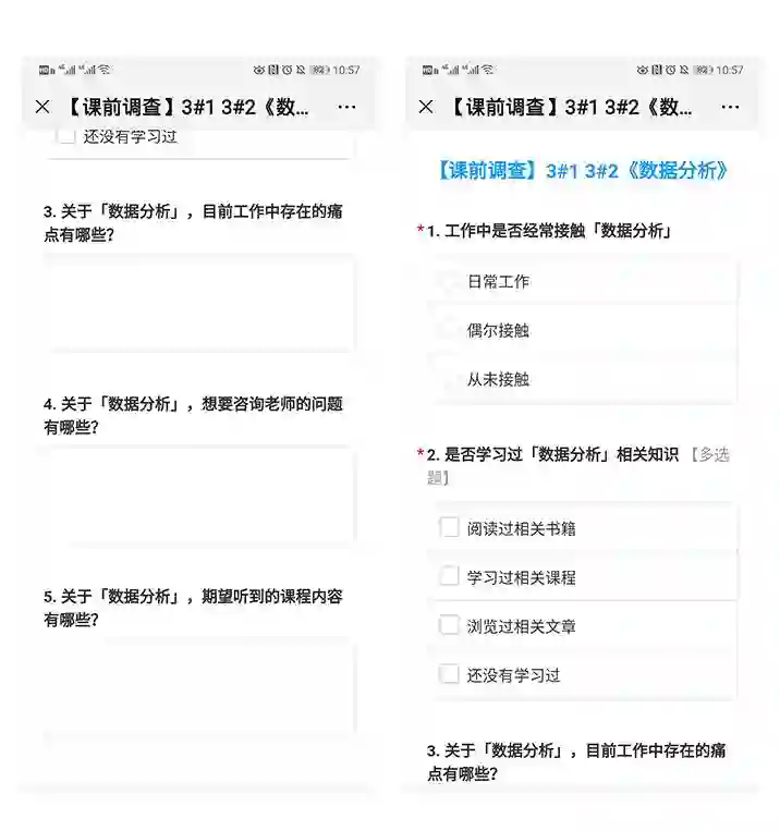 “以用户为中心”不只是说说而已,你会在每堂课前收到这样一份课前调查问卷,里面会让你详细填写自己针对下次课程所存在的问题和期望学习到的内容,希望你可以帮助我们做到真正的“因材施教”。