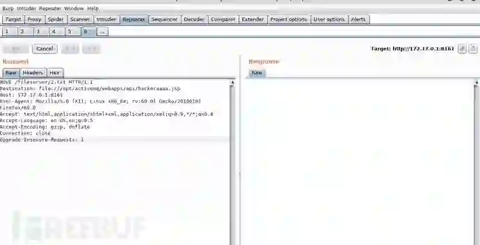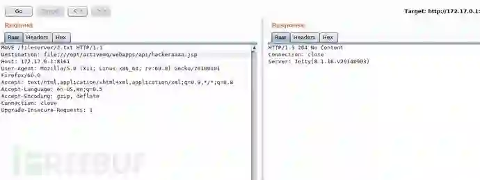 这里有一个坑,困惑了我很久,我的方法步骤都没有问题为什么MOVE方法会一直响应超时并且得不到任何响应的内容。尝试了很久,我一度怀疑我的vulhub环境有问题,一次偶然中我用burp抓到的包去修改执行MOVE方法很快就得到了响应结果,神奇的是把这个数据包重新复制到repeater执行再次出现响应超时的结果,明明是两个相同的数据包,真是令人费解,我只能归结于MOVE方法在这里不太稳(ps:这是我从别的文章看到的)。