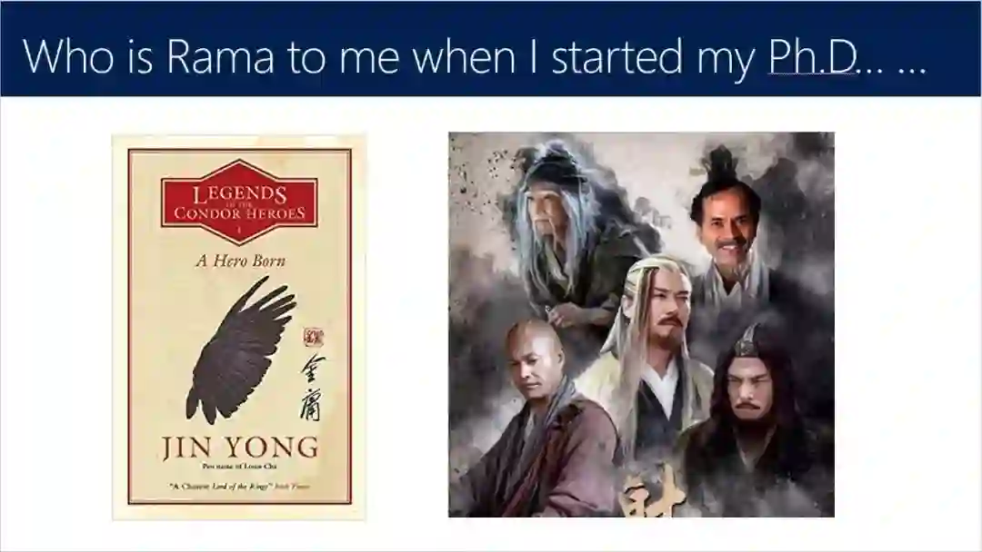 华刚开篇以射雕英雄传的武林世界来比喻视觉领域。在他念博士开始的第一课,吴郢给他介绍了视觉界的不同流派,其中一派就是来自马里兰大学。华山论剑论英雄,Rama当之无愧位于五绝之列。马里兰大学位居东部,所以Rama可谓视觉界的“东邪”。但论性情,Rama平易近人接地气,生性幽默领导范,倒是与洪七公颇有相似之处;Rama生性平和,对事情永远持正面态度,和南帝(僧)和中神通相同;但Rama在学术观点上有自己独到的见解,不随大流,坚持己见,这方面和西毒性格相同。所以Rama事实上是集五绝之长。