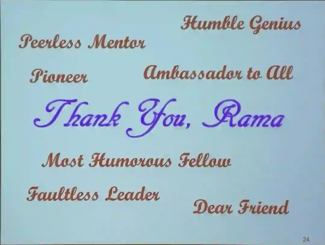 会议的最后是Rama致辞。秉持着一贯的幽默风范,他感谢了他的父母、妻子、儿女、老师们、朋友们、秘书Janice。当讲到学生的时候,他不禁动情,泪沾眼眶,默然无声了。