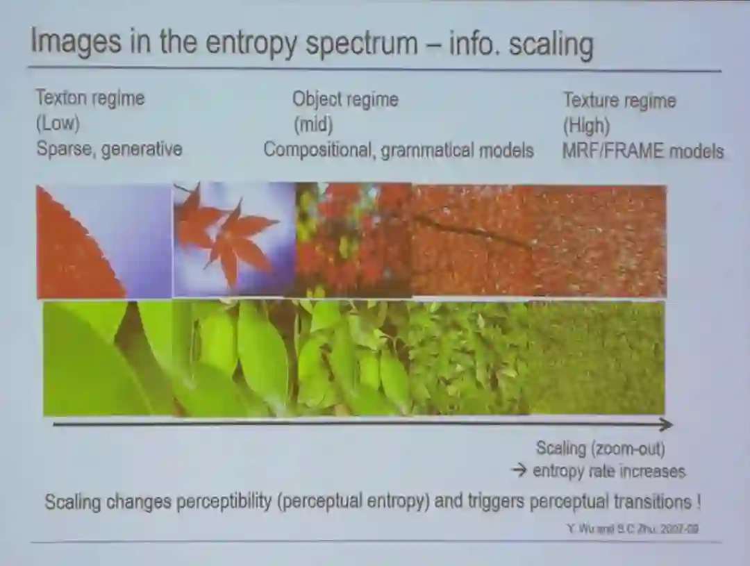朱进一步阐述了不同信息尺度下的图像,以及对应的相关统计模型。这里的信息尺度是指 entropy(熵),对应物理系统的温度。在不同的熵区,就有不同的法则和模型。