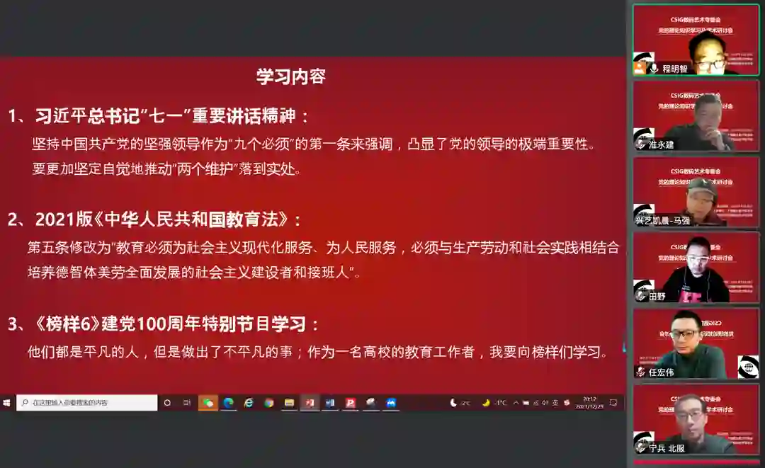 会议第二个议题是专委会全体委员进行党的理论知识学习,程明智秘书长领学了习近平总书记“七一”重要讲话精神、2021版《中华人民共和国教育法》以及建党100周年特别节目《榜样6》,倡导专委会委员要坚持围绕中心、服务大局,不断学习,更新观念,与时俱进,努力提高自己的业务水平和理论知识。