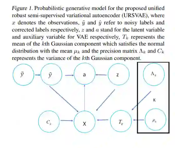 在统一鲁棒半监督变分自编码器(URSVAE)中,通过同时处理噪声标签和异常值,提出了一种新的噪声鲁棒半监督深度生成模型。输入数据的不确定性通常是将不确定性优先于概率密度分布的参数,以确保变分编码器对异常值的鲁棒性。随后,我们将噪声转换模型自然地集成到我们的模型中,以减轻噪声标签的有害影响。此外,为了进一步增强鲁棒性,采用鲁棒散度测度,推导并优化了新的变分下界来推断网络参数。通过证明对所提证据下界的影响函数是有界的,证明了所提模型在存在复合噪声的情况下在分类方面的巨大潜力。通过对图像分类任务的评价和与现有方法的比较,实验结果表明了该框架的优越性。