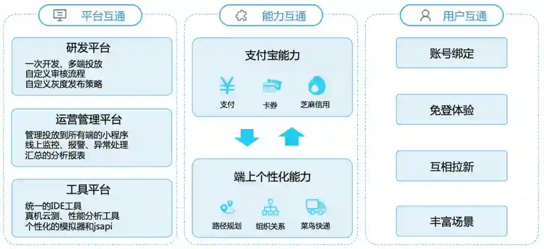 研发平台互通基于支付宝的开放平台能力,统一开发和发布流程,通过门户接入互通、开发者体系接入互通、审核能力接入互通、小程序研发链路接入互通、小程序运行链路接入互通,实现开发者一次开发、多端投放的能力。