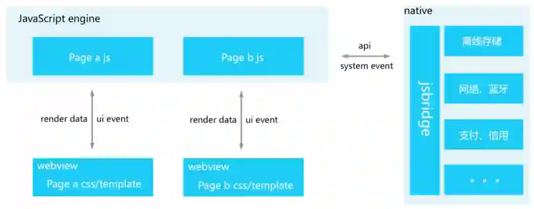 小程序编程模型是分为多个页面,每个页面有自己的 template、CSS 和 JS,实际在运行的时候,业务逻辑的 JS 代码是运行在独立的 JavaScript 引擎中,每个页面的 template 和 CSS 是运行在各自独立的 webview 里面,页面之间是通过函数 navigateTo 进行页面的切换。