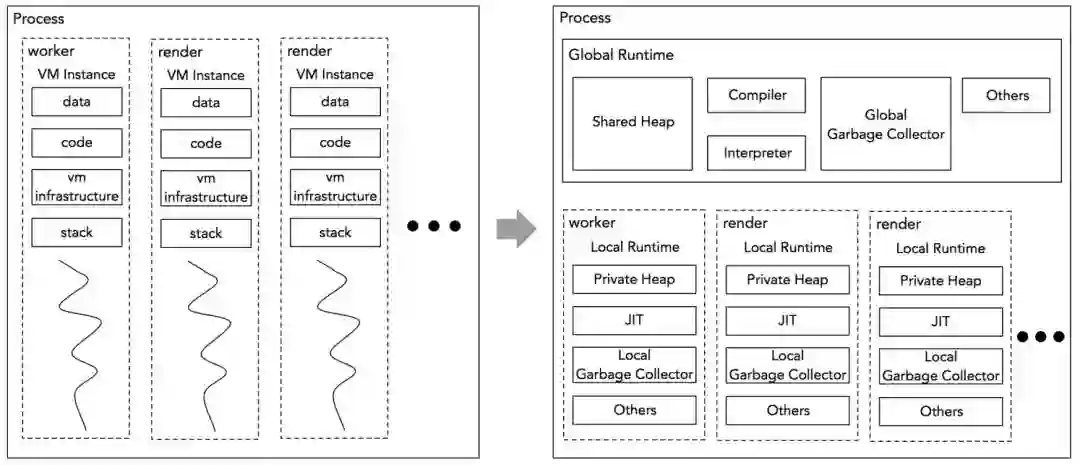 该方案将原始的 JS 虚拟机实例 (即 Isolate) 重新设计成了两个部分:Global Runtime 和 Local Runtime。