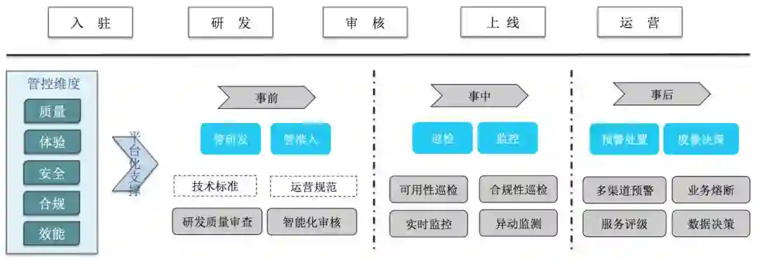 目前支付宝小程序拥有几十万生态合作伙伴,随着小程序生态的不断壮大,合作伙伴的数量也在急剧增加,如何对生态伙伴提供的服务形成有效的管控,如何对小程序的质量进行保障,这是我们面临的新挑战。面对这个问题,我们在制定相应技术标准和运营规范的同时,对小程序从入驻到运营,从质量、体验、安全、合规、效能等维度建设了平台化的质量与风险管控能力。