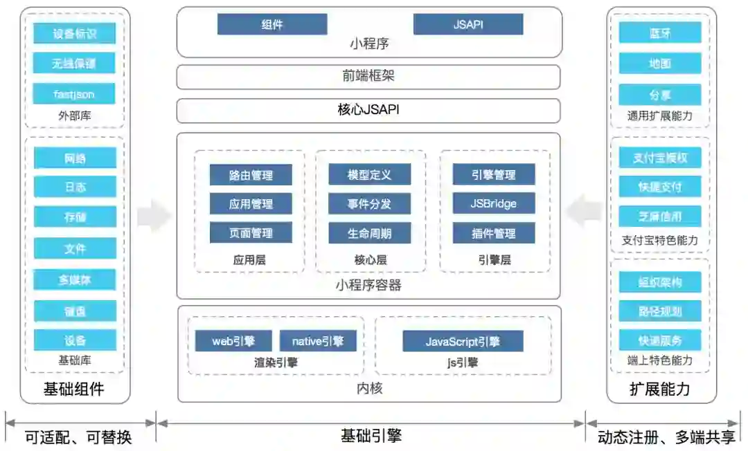 小程序输出的 SDK 包含两个部分,基础引擎和能力插件,基础引擎是必须的,不可替换的,它承载了小程序的基础能力,包括前端框架和容器的核心能力,以及提供渲染的内核。它提供了小程序核心的运行时和基础的核心组件和 JSAPI,同时提供了能力插件的插件容器,插件容器有良好的隔离性,不会因为插件的 crash 导致容器的 crash,保障了小程序核心运行时的稳定性。