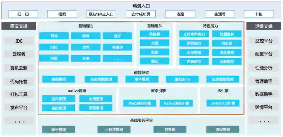 示意图左边和右边分别是面对开发者提供的研发支撑和运维支撑服务,可以帮助开发者更有效率的开发小程序,在上线后也提供众多的工具帮助开发者管理和运营线上的小程序。