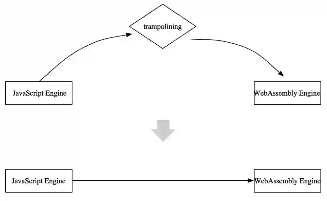 在做这个优化前,我们需要先了解下到底是什么原因导致了 js 和 WebAssembly 交互性能差。由于 JS 和 WebAssembly 是两种不同类型的语言,所以引擎执行过程中遇到语言切换的时候,需要做一些“翻译”工作。而这些翻译工作需要考虑各种情况,需要跳转到一个专门的 trampoline stub 处理。