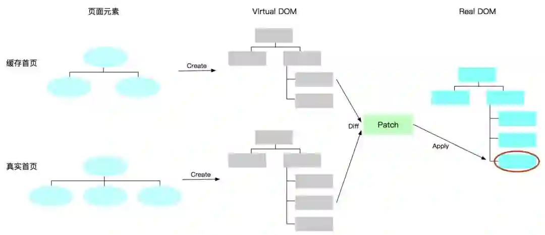 针对这个问题,我们是采用虚拟 dom 来解决,在加载缓存页面的时候把缓存页面放入初始的虚拟 dom 里面,真实页面创建后产生的虚拟 dom 跟缓存页面的虚拟 dom 进行 dom diff,把变化的内容通过 patch 传给浏览器内核,渲染对应的页面,这样就可以只更新局部有变化的页面内容,避免了整个页面的更新,也保证内容的准确性和实时性。
