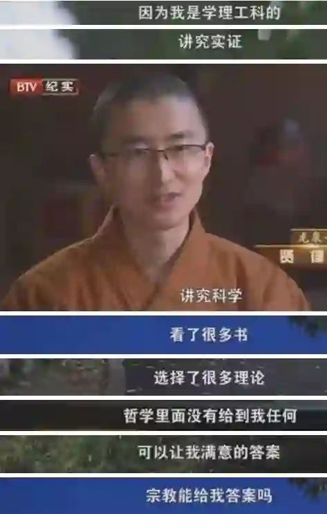 对于为何出家,北大光纤通信专业毕业的贤律法师,曾在接受BTV采访时,表示,自己是想通过宗教,寻求到答案。