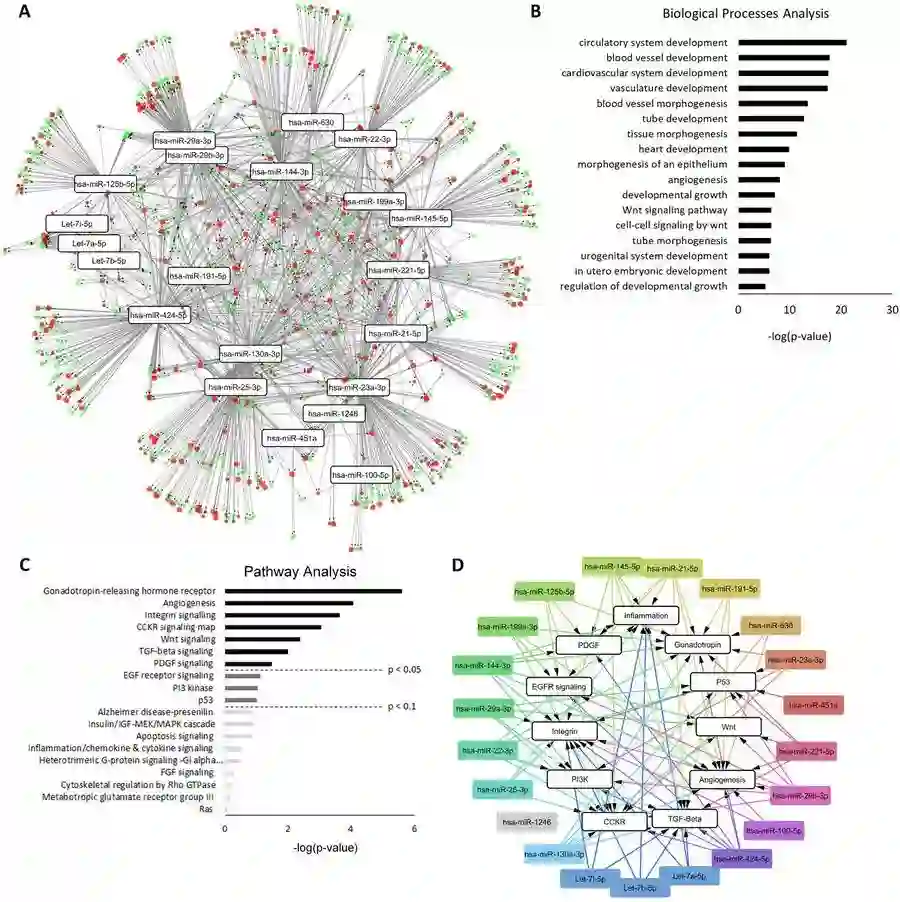 图:MSC外泌体中最丰富的miRNA靶向的过程和途径。使用miRDIP分析MSC外泌体中包含的23种最丰富的miRNA以确定靶基因表达谱(5481个基因)。其中,1317个基因占了差异表达的前三分之二,并被PANTHER进一步分析确定是统计学上丰富的由靶基因调控的生物学过程和途径。只有高于平均值(1.81倍)且符合统计学显著性差异(p <1e-6)的靶点被认为是可能的生物学过程和途径。 (A)MSC外泌体中前23个miRNA靶向的生物学过程的富集图。节点代表显着富集的生物过程的基因和靶向它们的miRNA间的连接点。与血管生物学过程有关的基因显示为小红色圆圈,生长相关基因显示在绿色圆圈中,并且与血管形成和生长都相关的基因显示为大红色圆圈。靶向相似基因簇的miRNA位于彼此靠近的位置(例如let-7(a,b,i)-5p和hsa-miR-29(a,b)-3p)。 (B)根据从高到低的显著性排列的前23个miRNA靶向的最丰富的生物学过程和(C)富集的途径。 (D)前23个miRNA靶向的通路的富集图。节点代表显著富集的途径和靶向它们的miRNA。