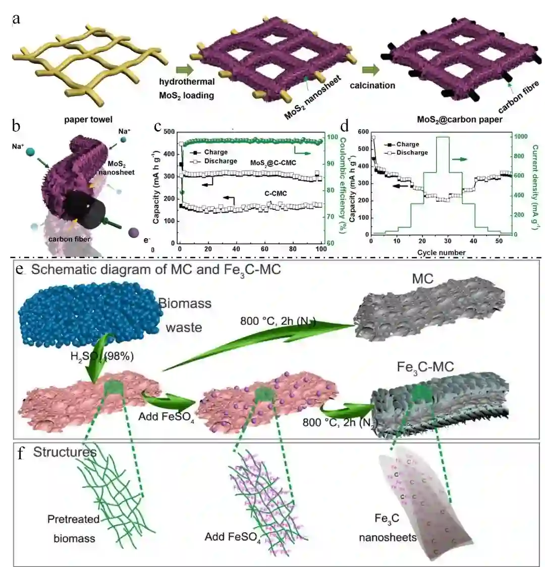 将生物质衍生碳与具有高容量的电极材料进行复合形成的复合结构能够协同提升扩散动力学并增加存储位点。例如,将生物质衍生碳与金属化合物进行复合。生物质衍生碳含有丰富的杂原子、分层孔结构和高的比表面积能够提供更多的高速离子扩散和电子传输路径,改善复合电极材料的扩散动力学。金属化合物能够基于合金、插入和转化反应大幅度增加复合电极材料的存储位点。