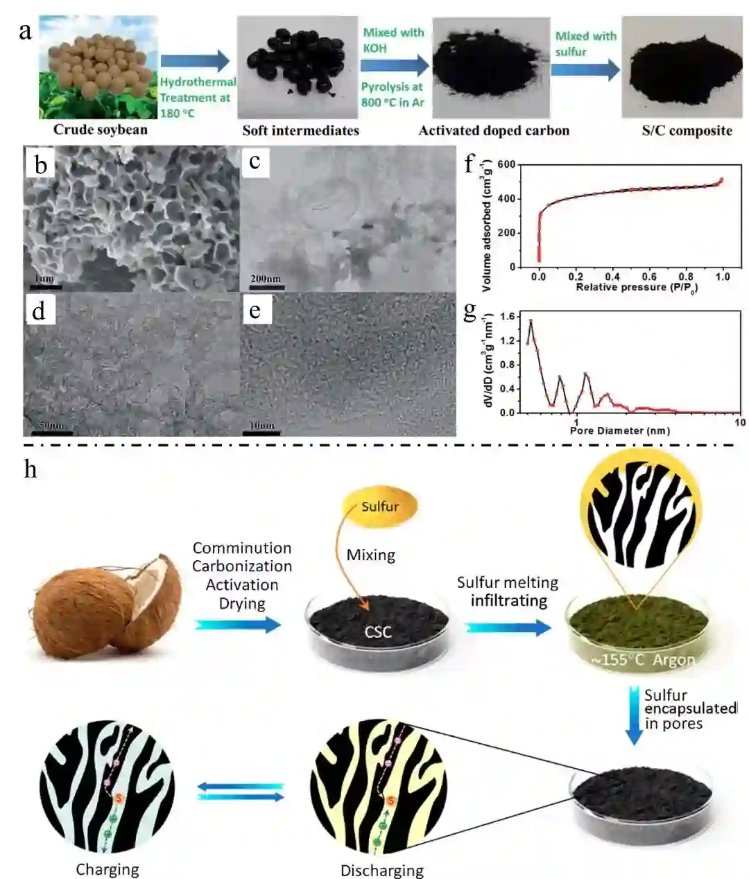 层级孔结构由 2 nm 以下的微孔,2~50 nm 的介孔和 50 nm 以上的大孔组成。在钠离子电池中,它能够为电解液进入生物质衍生碳表面提供有效通道,进而缩短钠离子的扩散路径。它还能够增加生物质衍生碳的比表面积,从而提供更多的有效吸收存储位点。在超级电容器中,它可以通过提供快速的离子/电子转移动力学和减轻充放电过程中的结构破坏来增加赝电容容量。在锂-硫电池中,它能形成一个电子导电网络来捕获可溶的多硫化物中间产物,有效地提高硫在锂离子反应中的利用率。