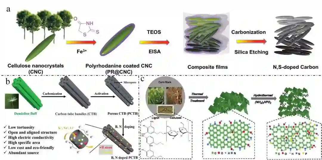 4. 相比于单原子掺杂,双/多原子掺杂具有协同效应,可以提高生物质衍生碳的整体性能。然而,目前研究大多集中在氮掺杂及其共掺杂方面,应扩展到其他原子的共/多掺杂。