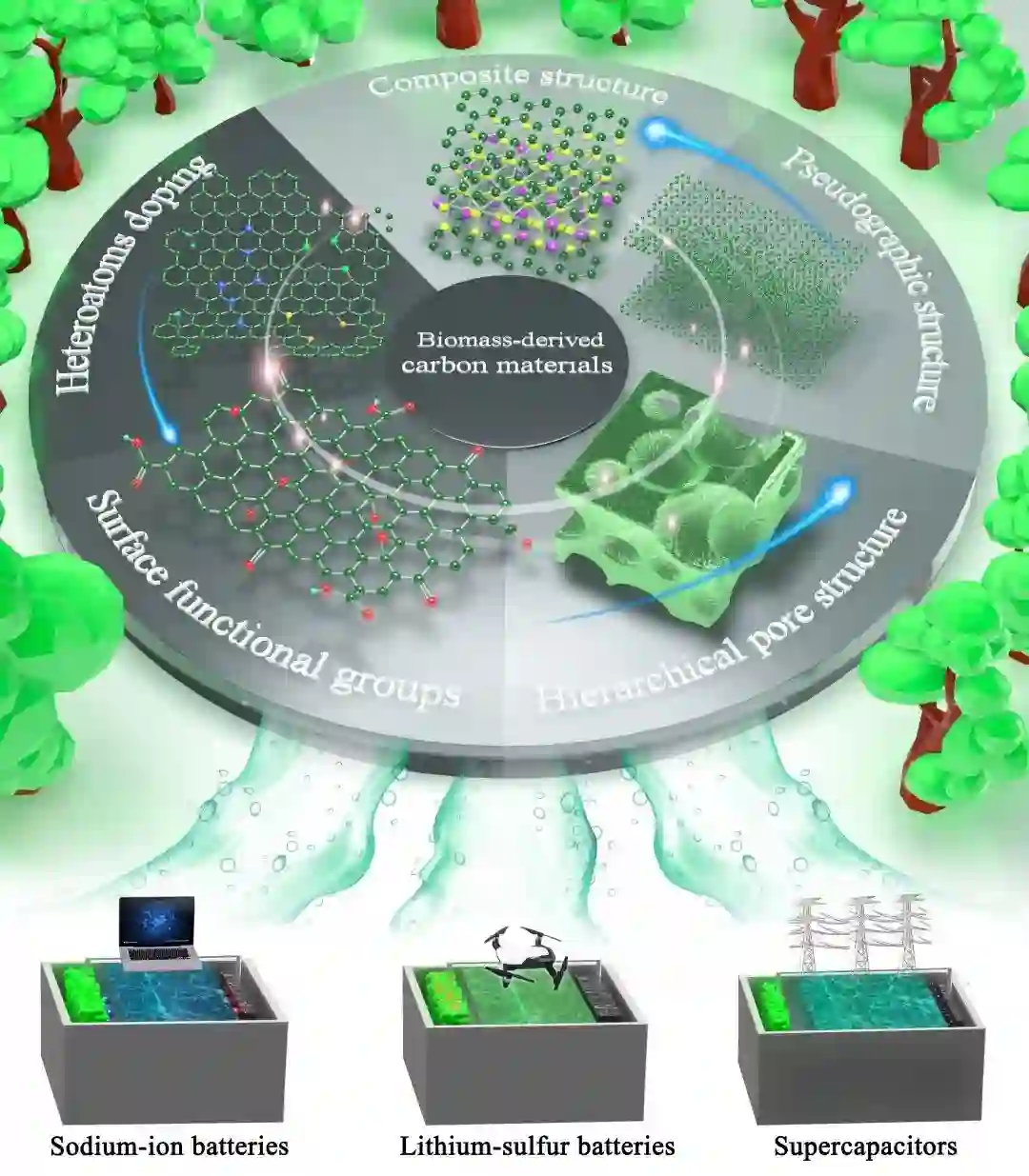 文章系统地综述了生物质衍生碳作为一种可持续,绿色电极在电化学能量存储设备中的应用,重点从调控类石墨结构、层级孔结构、表面官能团结构、异质原子掺杂结构和复合结构的角度总结提高有效存储位点和扩散动力学的各种机制,揭示了生物质衍生碳在钠离子电池、锂-硫电池和超级电容器中提升电化学性能的机理。