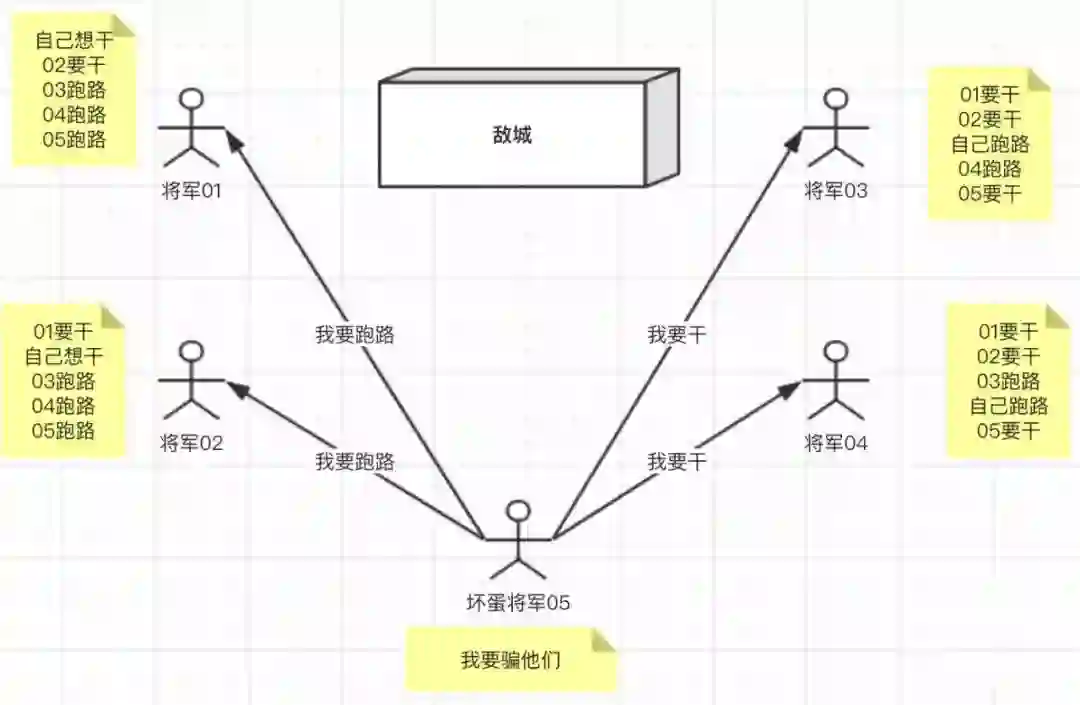 坏蛋将军05就可以理解为一个作恶的节点,他向不同的节点传递不同的消息,让系统内部的信息出现了不一致。(来源:liheng)