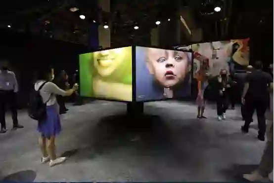 2021 年 11 月佛罗里达州迈阿密海滩 Tezos 展上,观众正驻足观看德国艺术家 Mario Klingemann 创作的 NFT 艺术品。Tezos 是专供 NFT 艺术家们使用的低能耗区块链项目。