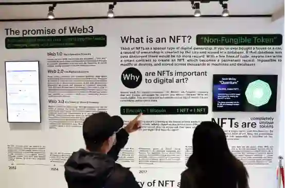 今年 1 月 29 日,参观者在西雅图 NFT 博物馆周末开幕活动中阅读关于 Web 3.0 与 NFT 的消息。