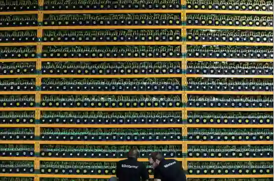 2018 年,两位技术人员正在魁北克圣亚森特的 Bitfarms 服务器农场检查比特币采矿情况。