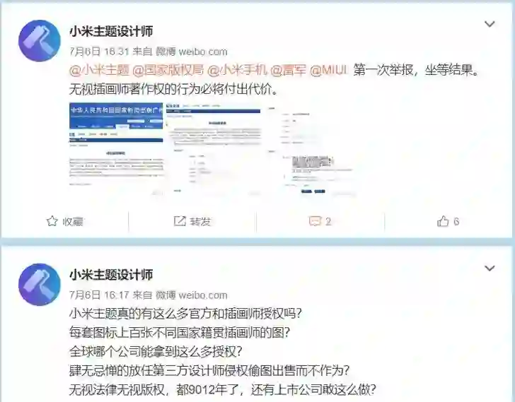 有微博网友反映,小米主题存在“肆无忌惮的放任第三方设计师侵权偷图出售而不作为”的问题,随后该网友还放出了在中华人民共和国国家新闻出版广电总局的举报截图。