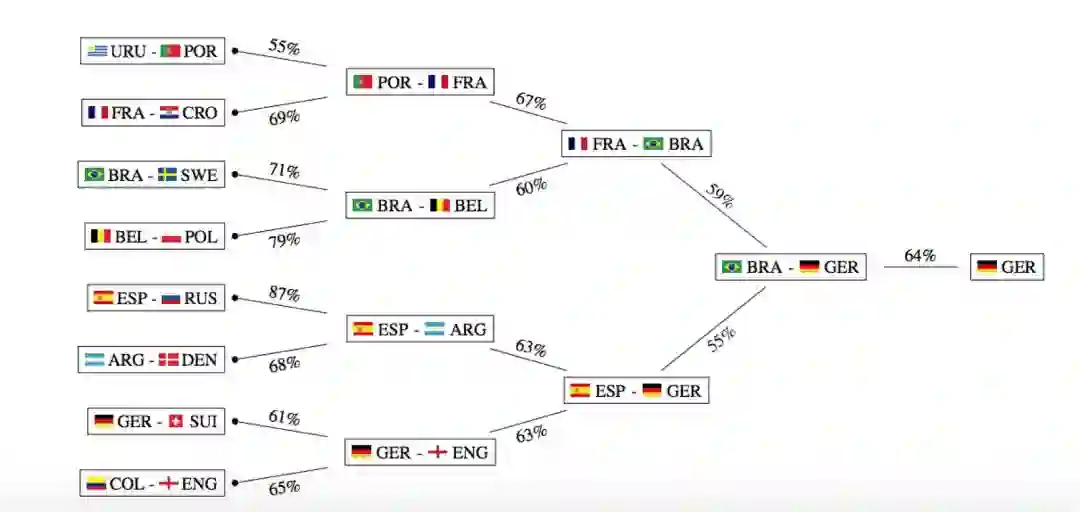 他们的算法模型预测,在小组赛还未开始时,最有可能夺冠的球队为西班牙、德国、和巴西,但当团队对比赛进行了 10 万次模拟后,发现如果德国和西班牙挺进四分之一决赛,则两者夺冠的胜率就会持平。但世事难料,他们的机器学习算法显然不会料到西班牙会在首战失利后更换主教练。