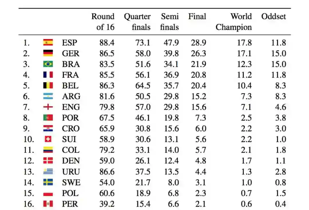 即便如此,随着夺冠大热门德国在小组赛出局,以及西班牙止步 16 强,这些人工智能都被“打脸”了,几乎无一幸免。