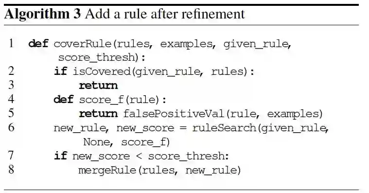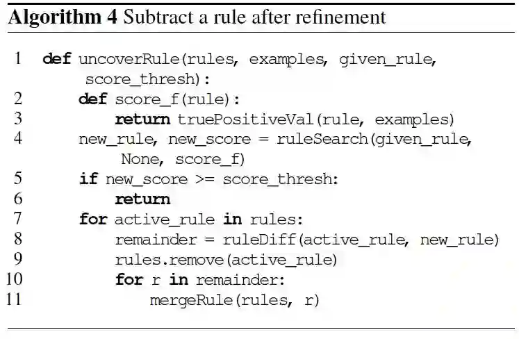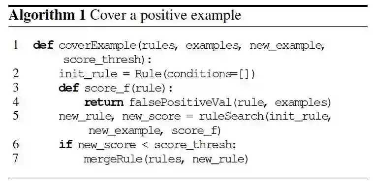 而且因为这种规则学习是建立于与人环境交互中的,与一般的 separate-and-conquer 算法不一样,这是一种在线学习过程,当一个新的样本被接收时,规则的改变是通过 beam search 逐渐改变,规则的更新是基于一个返回值 score 来确定是否接纳/移除新的规则。另外 separate-and-conquer 规则跟流行的 divide-and-conquest 的主要区别是该算法考虑新规则时,会同时考虑正负两方,会尽量最大化正样本和最小化负样本。关于 separate-and-conquer 和 divide-and-conquest 的结合和比较,可以参考 [1.2]: