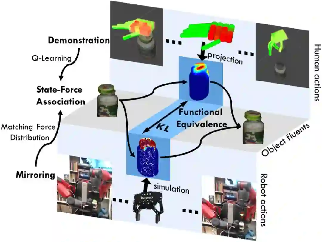 本文的创新性在于 1) 采用了触觉手套来感应不同程度的力度,2) 通过 Q 强化学习和语义模型,以目标为主(goal-directed)学习对应的状态和力度;3)利用物理模拟器模拟不同的机器人动作和力度可以建立功能等同的动作。