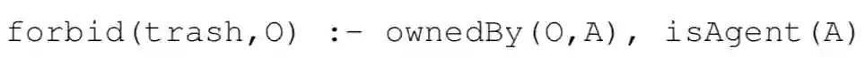 怎样把物品所有权和规范联系起来呢?比如说有一个规范说机器人不能丢掉有主人的物品,那么通过之前的物品所有权的学习,机器人眼中的物品所有权规可以通过 Prolog 范式进行描述,例如: