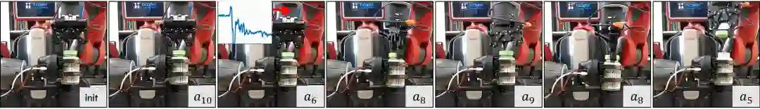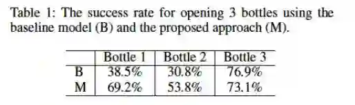 在学习过程之后,在机器人上执行学习模型如下图所示让机器人完成打开药瓶的动作。首先从学习策略引起的 T-AoG 中对解析树进行采样,以获得机器人应该模仿的一系列力类型,以便引起对象状态的相对变化。然后,Baxter 机器人的执行从初始位置开始并顺序执行相应的基元。在下图中,a6 会产生由机器人手腕中的力传感器(左上)捕获的力,比较数据表明提出的镜像方法确实比 baseline 方法能成功打开瓶子。